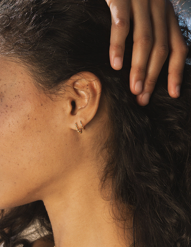 A playful twist on a Baleen favorite. The Bubble Nautilus Hoop reimagines our signature Nautilus Hoop with a beaded wire that adds texture and shine. Just like the original, this clever design threads through the ear to create the illusion of a double hoop — but with a bubbly new personality. Lightweight, unique, and endlessly versatile, it’s the perfect balance of modern edge and subtle fun.