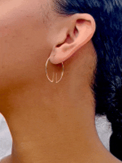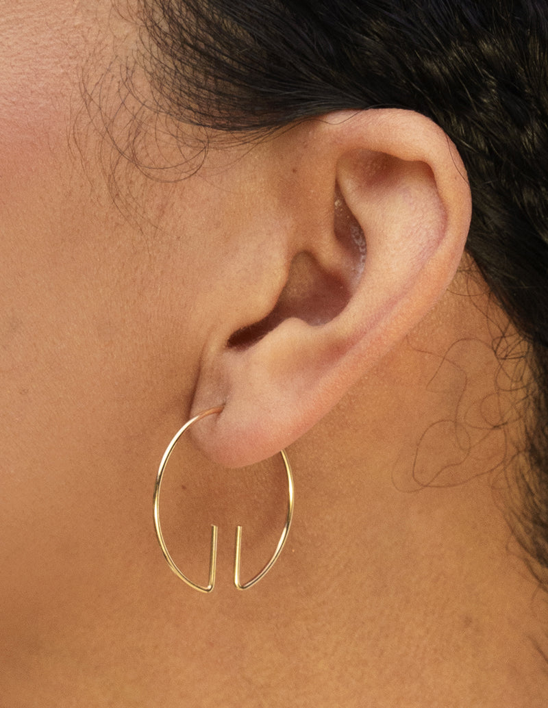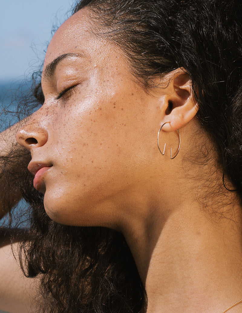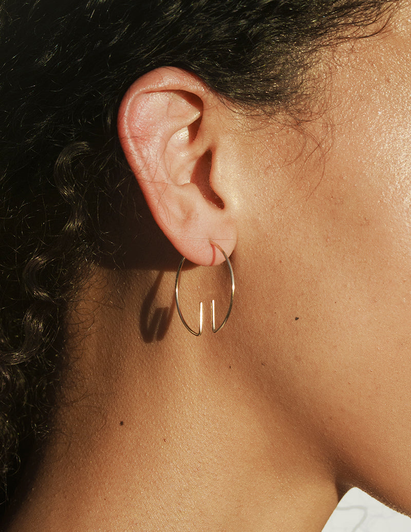 The Aperture Earring forms a clean hoop shape with a small opening at the base, where two short lines extend upward to frame the space between them. The negative space becomes part of the design, giving the piece a light, sculptural feel.