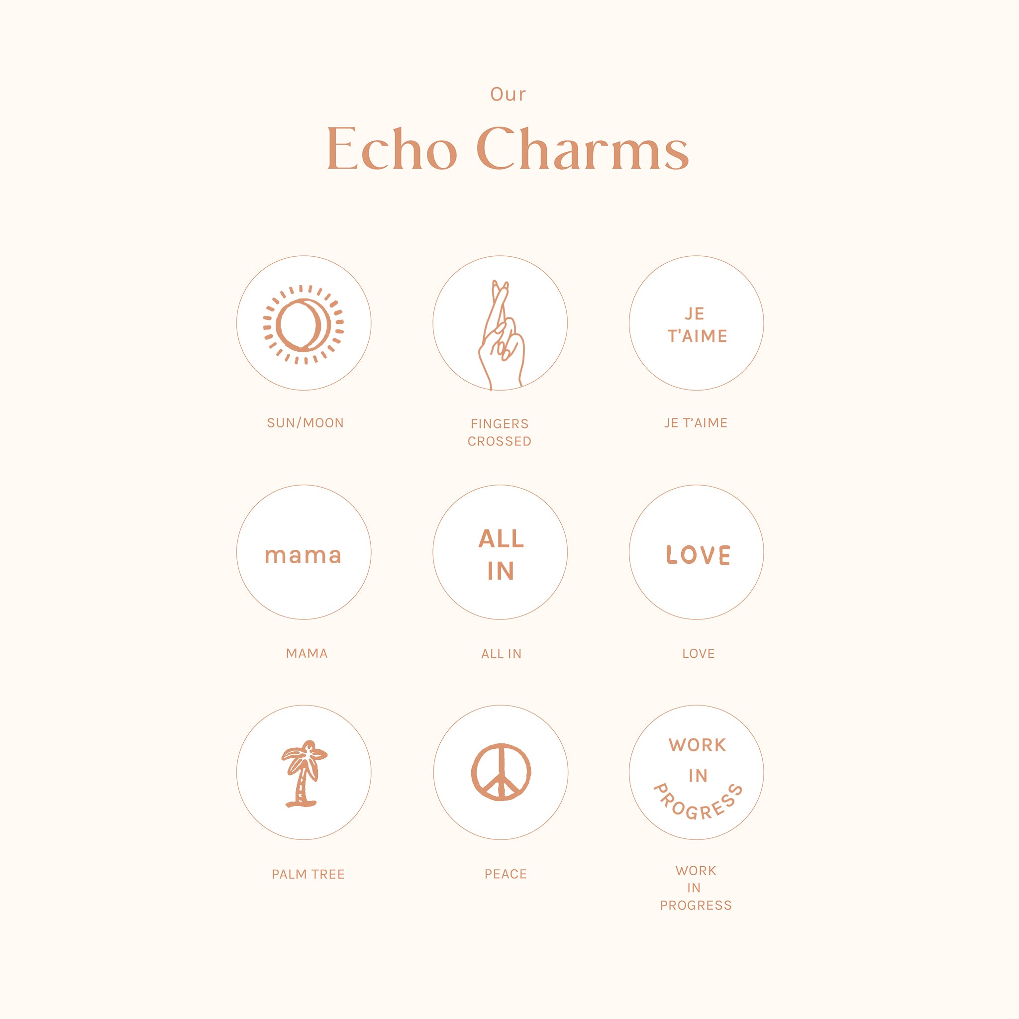 Little circles, big feelings. ✨ Each Echo Charm is a hand-stamped disc made to capture a mood, a mantra, or a moment worth remembering — like a hopeful fingers-crossed, the calm balance of sun and moon, or a gentle reminder that we’re all a work in progress. Individually hand-stamped, these charms are tiny reflections of what you feel, believe, or wish for.