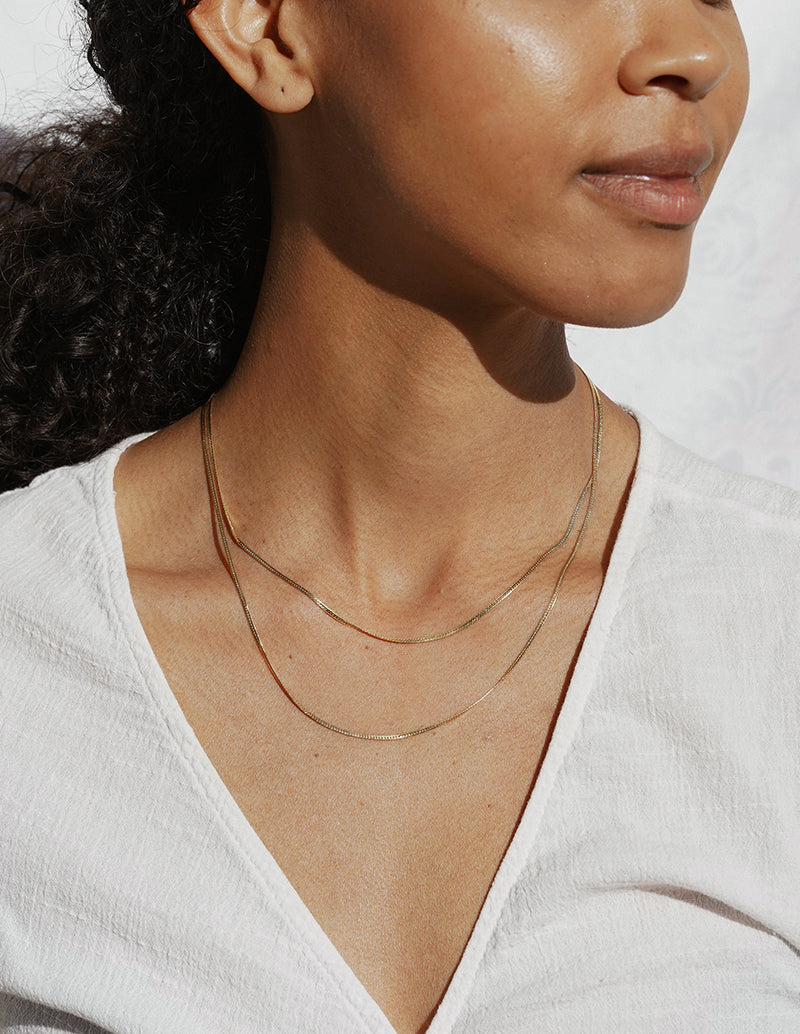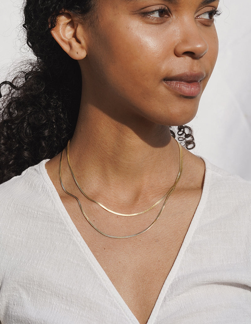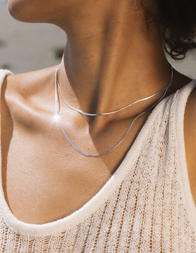 Sleek, slinky, and effortlessly chic. Meet The Herringbone Necklace—Crafted from high-quality Sterling Silver, this beauty drapes like liquid, catching the light with every move. Available in two widths and two lengths for just the right amount of shimmer, it’s the kind of timeless staple that goes with literally everything—from your favorite vintage tee to that little black dress. Wear it solo or layer it up—either way, it’s giving effortless elegance.