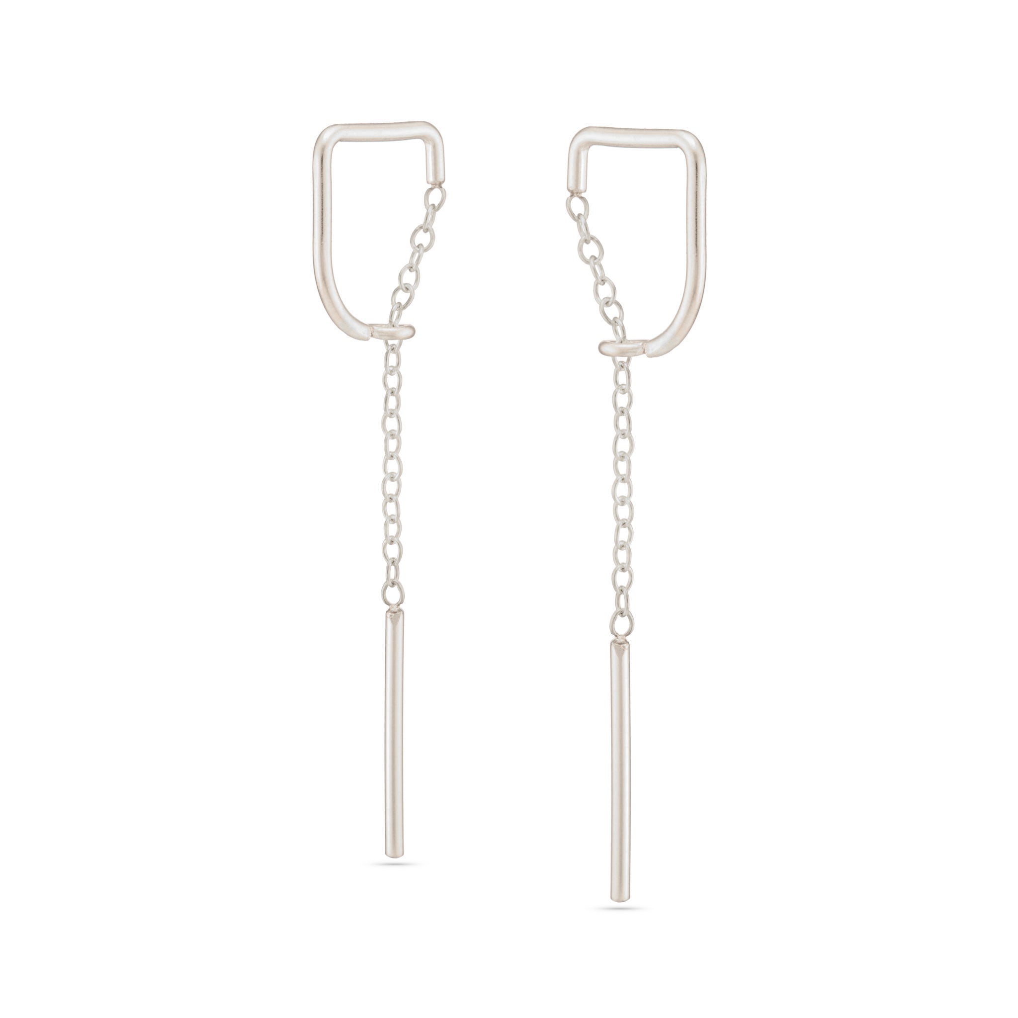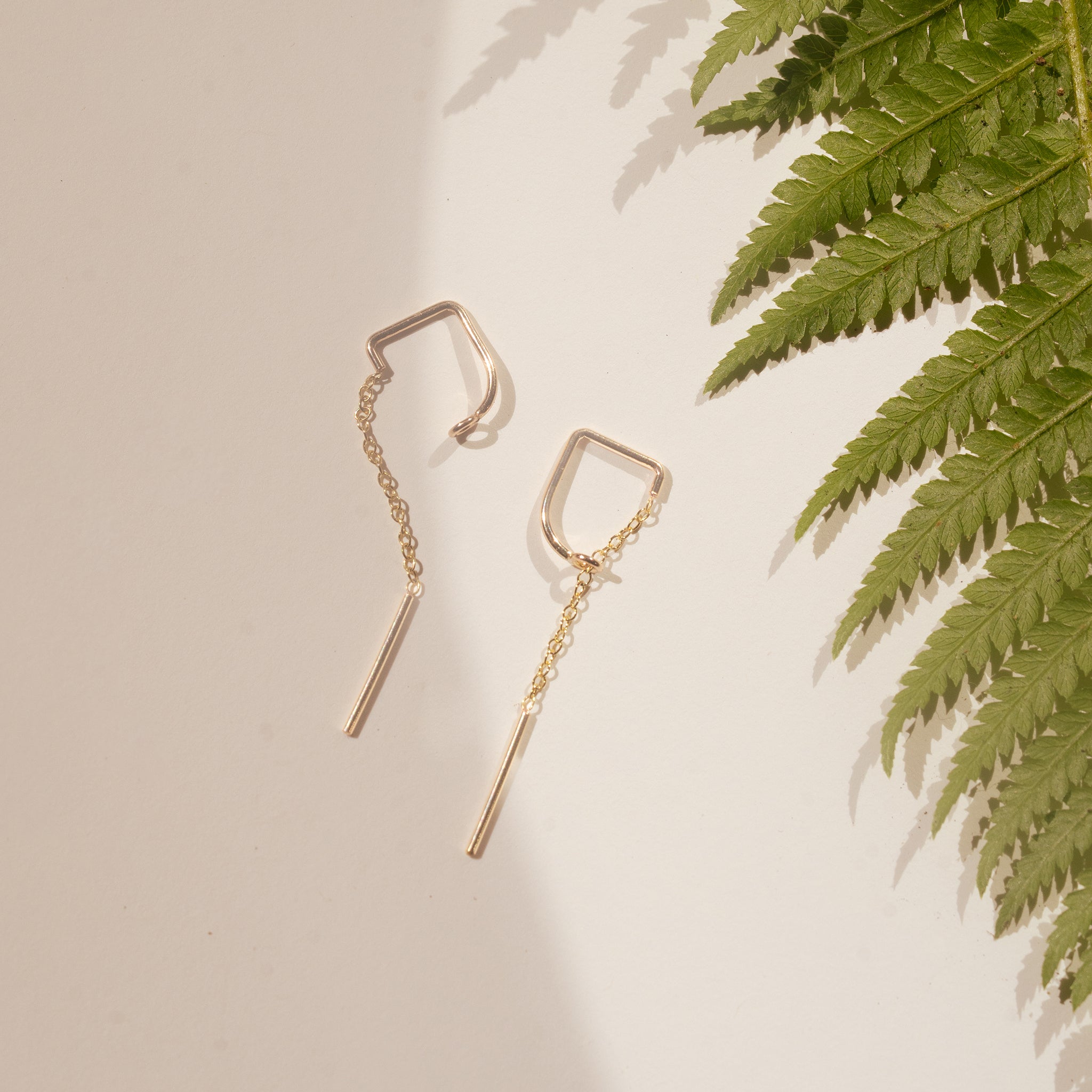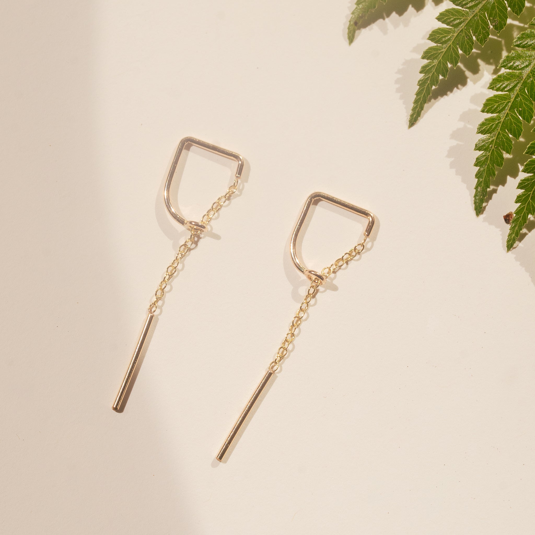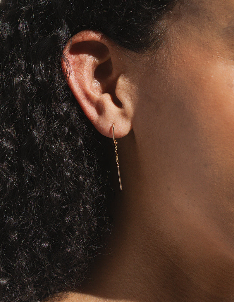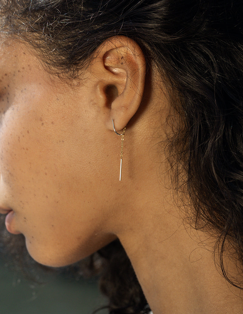 A little swing, a little shine — Giddy-up! The Rodeo Earring is made to move with you. Featuring a sculptural U-shaped hoop paired with a delicate chain and sleek bar that drops through a tiny ring, this design blends structure with fluidity. Lightweight and comfortable, it adds just the right amount of playfulness to a minimal silhouette, making it perfect for everyday wear or a subtle statement at night.